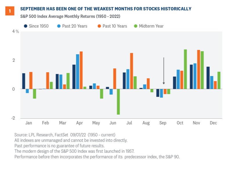 So will this September be another struggle? The combination of peak hawkishness from the Fed and the frustratingly slow pace at which inflation is cooling could continue to weigh on stocks for another month or more. Meanwhile, earnings season is no longer available as a potential positive market catalyst, Europe’s energy crisis is worsening, and COVID-19-related lockdowns in China are continuing.